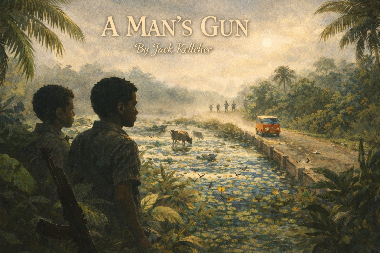The jefe said, ‘Gracias muchachos’ and patted Nacio on the side of his head. ‘Now go home quickly.’ Tito stepped back, but planted his feet, took a deep breath, and looked up at him. ‘Jefe, those gringos have two 50 caliber machine guns and six AKs. They’re Cuban Kalashnikovs. Can I have one of the AKs?’