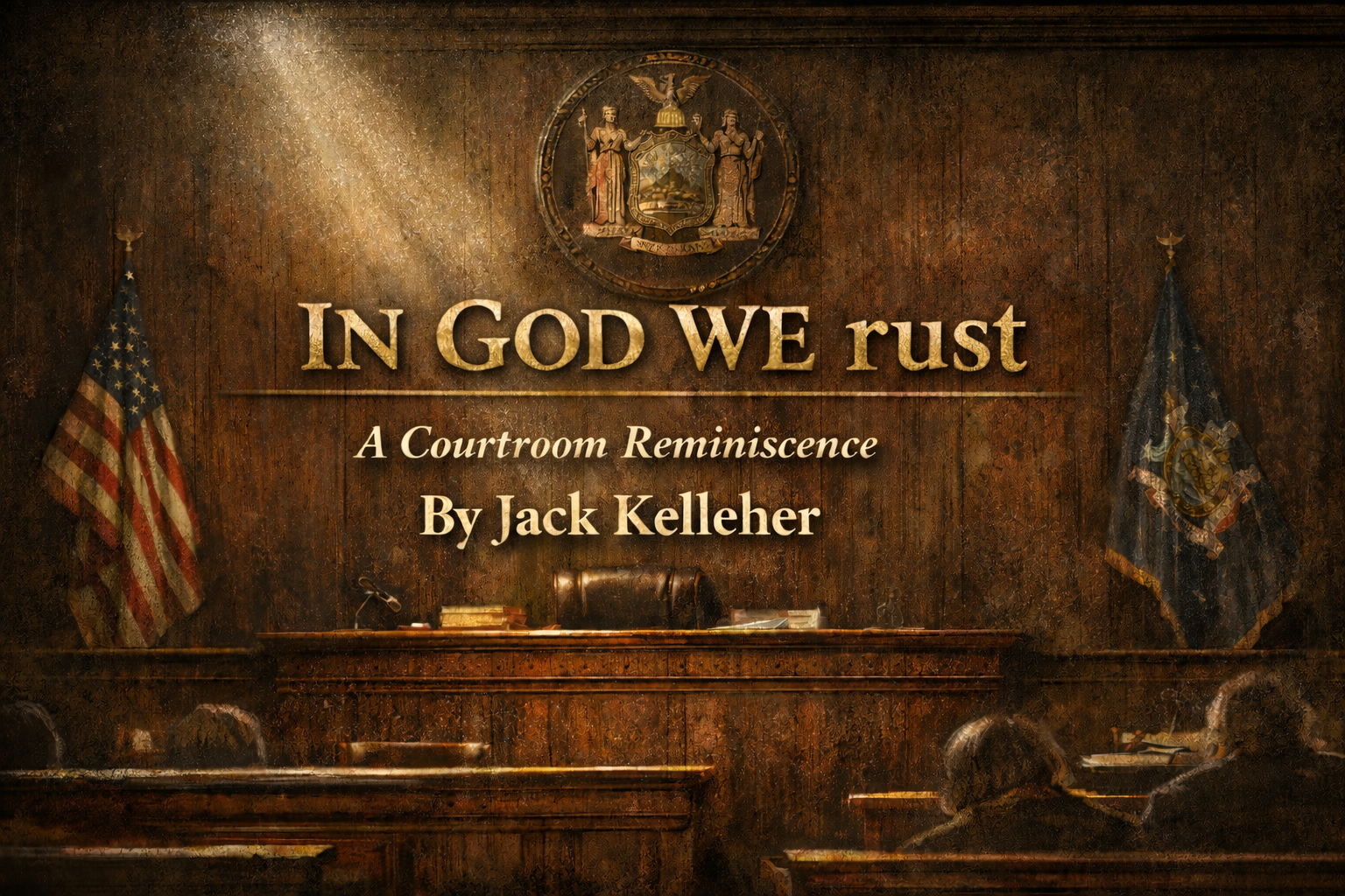 If the judge was new, the courtroom wasn’t. I’d practiced in 1-A as a rookie thirty-five years ago and nothing had changed but the players. The wooden railing, floors, and benches were black with grime. Dim yellowed light filtered through windows which hadn’t been washed since Tom Dewey was District Attorney. And, my favorite, the capital ‘T’ in word Trust had fallen off so long ago that you couldn’t even see a dirt shadow where it had been. On the wall high above the Hon. Dick, above the Great Seal of the State of New York, framed by two ancient flags, brass lettering proclaimed “In God We rust.”