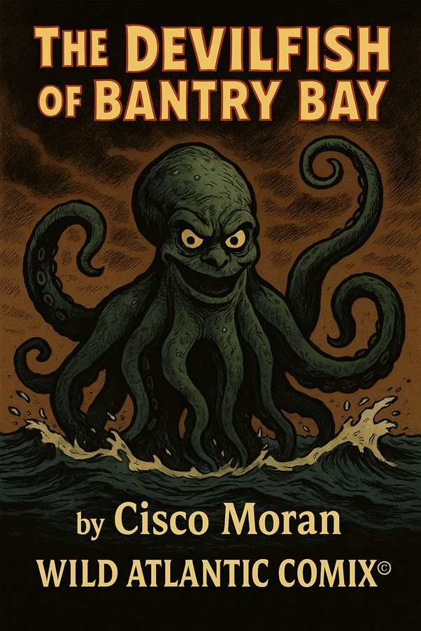 One day, Master Seamus parked up his pushbike and was sitting on a rock just outside the village. He was hoping to encounter some truant children absconding from the National School whom he could change into jellyfish, sea urchins, and flowering peanut worms. And just when he was giving up hope two boys came whizzing up on skateboards and began throwing stones at sea birds and, shortly, each other. The sorcerer was beside himself with delight at the very thought of the spell he might conjure up for them. So, he uttered the mightiest incantation he knew. ‘Transmogrophis Hsiflived’ he shouted, but in his excitement the wizard was careless, and his magic bounced off the water right back at him. He instantly changed into a giant, thirty-foot octopus, a devilfish.