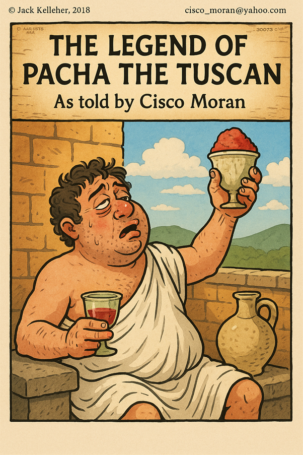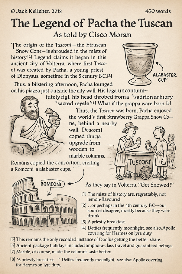 The secret soon spread. Pacha told Lucre Causa, the High Priest, and together they began selling Tusconi from a pushcart in Volterra’s Saturday Market. Romans on package holidays [6] flocked to it. The temple coffers swelled, enabling the clergy to upgrade from wooden to marble columns.[7]