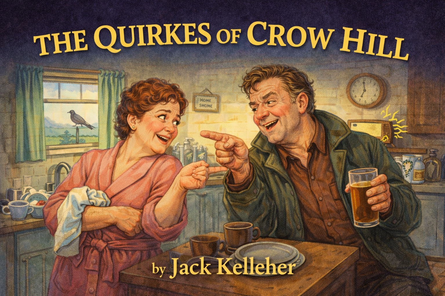 ‘ANNOUNCER: Welcome everyone. Tonight, we have the pleasure of offering you the first episode of ‘The Quirkes,’ the story of a couple living with their children in Crow Hill, a crossroads farming hamlet in rural Ireland. It is 9:30 PM and Sean is watching ‘High Chaparral,’ as he does every Saturday night with religious fidelity, sleeping soundly on the couch. Moira stands leaning against the frame of the kitchen door. She is polishing a diner plate and daydreaming, away with the fairies.